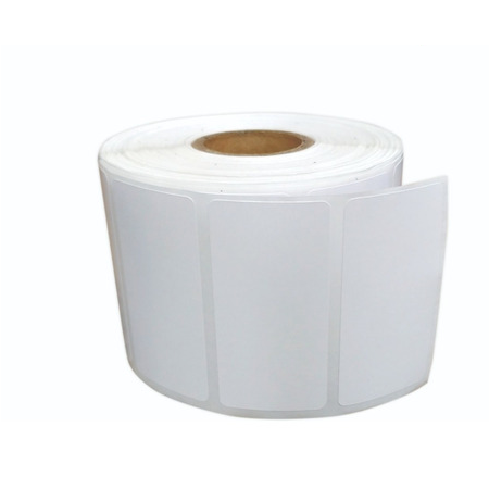 Presentación en rollo con 1000 etiquetas sintéticas térmicas c/u de 50×25 mm, centro de 1.5 pulgadas de diámetro, ideal para impresoras de escritorio